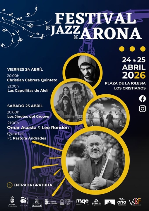 La Plaza de la Iglesia de Los Cristianos se convierte en el epicentro del jazz con dos noches llenas de ritmo, talento y fusión musical. El festival reúne propuestas contemporáneas y clásicas, desde el elegante sonido del Christian Cabrera Quinteto hasta la frescura de Las Capullitas de Alelí, sin olvidar la energía de Los Jinetes del Groove y la sensibilidad de Omar Acosta & Leo Rondón Quartet junto a Pastora Andrades. Una cita imprescindible para disfrutar de la música en vivo bajo las estrellas.