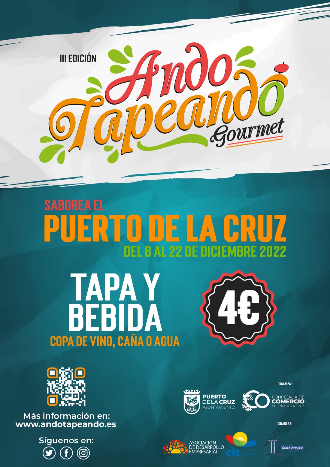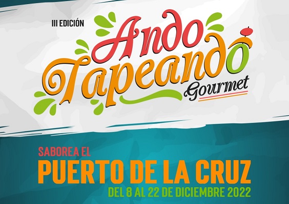 Ando Tapeando Gourmet Start date: Thursday, December 8, 2022 End date: Thursday, December 22, 2022 Location: Puerto de la Cruz Link: Visit Facebook: Visit https://andotapeando.es/