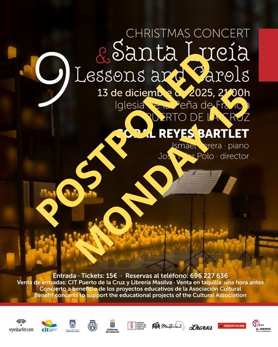 Debido a las inclemencias climatológicas se pospone el concierto para el lunes a la misma hora. Perdonen las molestias.