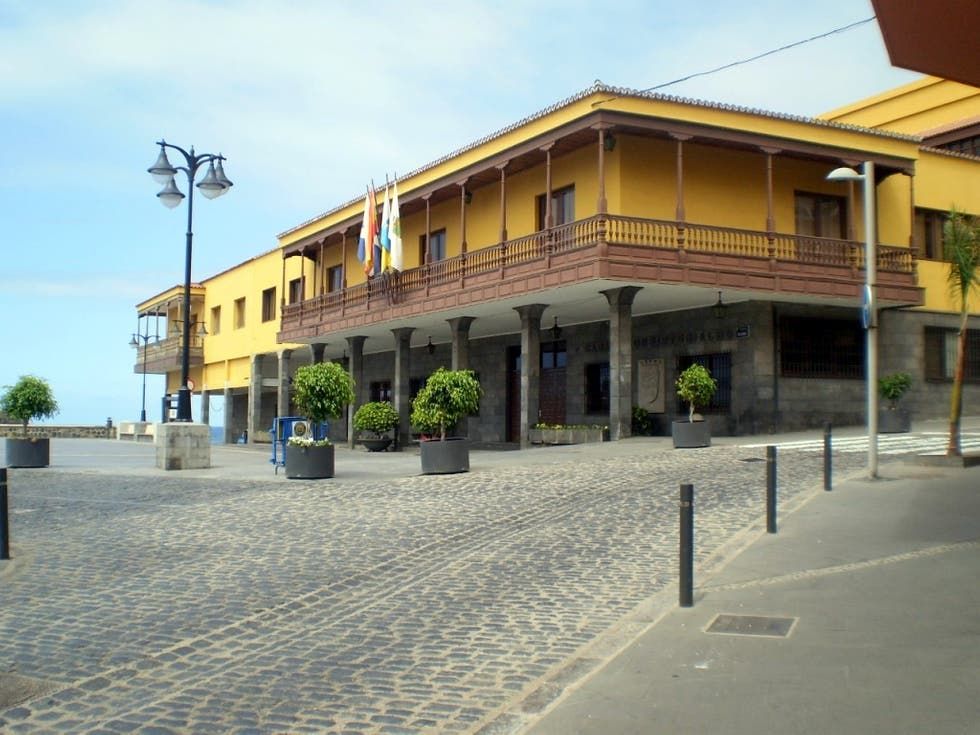 Siguiendo el curso de dicha vía, llegamos al AYUNTAMIENTO, cuya edificación remodelada data de 1973. En su fachada podemos admirar el escudo heráldico de la ciudad diseñado por Monseñor Bruno Heim, cuya leyenda dice: En el centro, el dragón de sinople linguado de gules, mítico guardián del Jardín de las Hespérides, más allá de las columnas de Hércules, el Edén de las tres Ninfas de Oro; sobre sus lomos, la cruz latina de gules, la cruz del Puerto que contempla su nombre y sus tradiciones; bajo las garras de aquel la acompaña de azul y tres fajas ondeadas de plata, las ondas navegantes raíces de la ciudad como medio de comercio y expansión; superpuesta, la llave de sable que abre el camino a las rutas de las indias; al timbre, la corona reflejo de la monarquía de los Reyes Católicos.