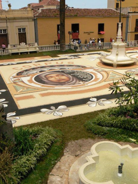 Con bastantes días de antelación las familias y entidades comerciales hacen el diseño de las alfombras sobre papel o esteras que serán rellenadas con flores, mientras los hombres y los niños entretejen el diseño, las mujeres desgranan pétalos. Todos participan poniendo de relieve la estructura social del municipio. La alfombra más espectacular es la que se realiza en la Plaza del Ayuntamiento. Confeccionada con arenas volcánicas de distintas tonalidades obtenidas en las zonas altas de las Cañadas del Teide. Suele representar un tríptico con diferentes episodios bíblicos. Ninguna de estas figuras, imágenes y tapices florales son repetidos en años posteriores.