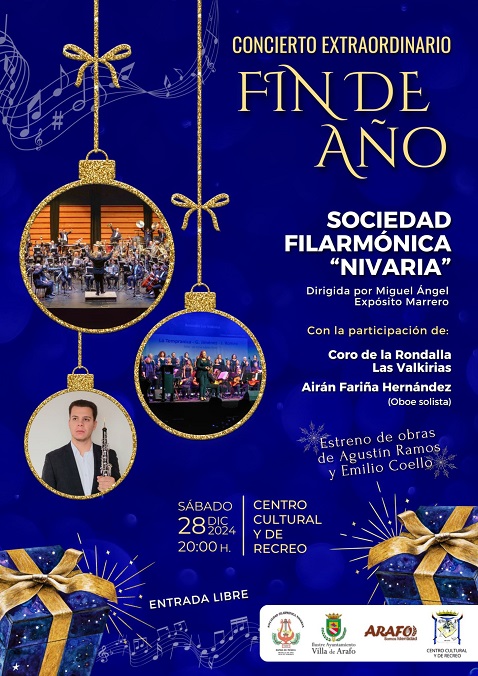 El próximo sábado 28 de diciembre a las 20:00 horas, en el Centro Cultural y de Recreo de la Villa de Arafo, actuaremos en el XXXIX Concierto de Fin de Año.Contaremos con la participación del Coro de la Rondalla "Las Valkirias" y el oboe solista Airán Fariña Hernández.Estrenaremos obras de Agustín Ramos y Emilio Coello.Entrada libre hasta completar aforo.