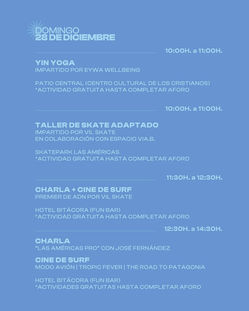 Los días 27 y 28 de diciembre, el CSFF Tenerife llega a Arona con un completo programa de actividades que une cine, mar y cultura surf. Una cita imprescindible para despedir el año disfrutando de las mejores historias ligadas al océano.